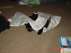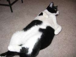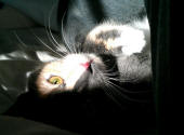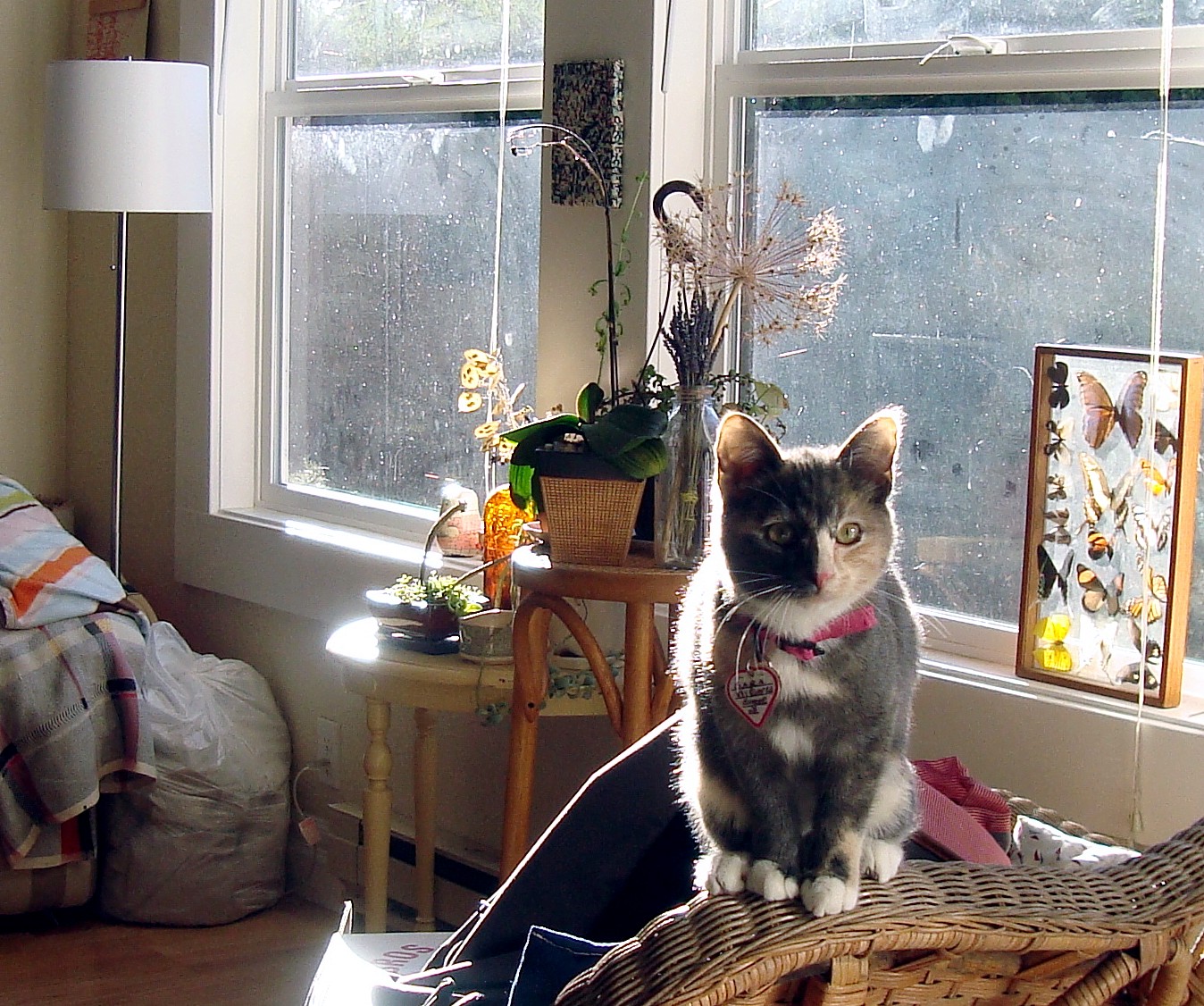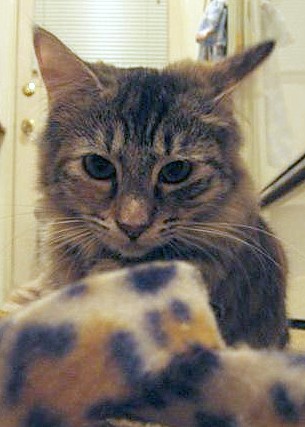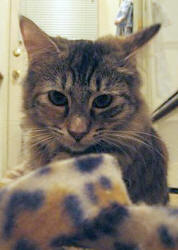 SIBYL Sibyl is doing great. My previous cat, Devilin, threw a 3 month long temper tantrum when I brought Sibyl home. But now they are best of friends. Their games of Tag through the house wake me up at least once a night. Sibyl passes the day sleeping on the back of the couch, playing with Devilin, cuddling with me while I watch TV, and hissing at pedestrians that walk by the front window. Thank you S.A.R.A. for all you do to keep saving lives like Sibyl’s. -Rio (S.A.R.A. Volunteer) |